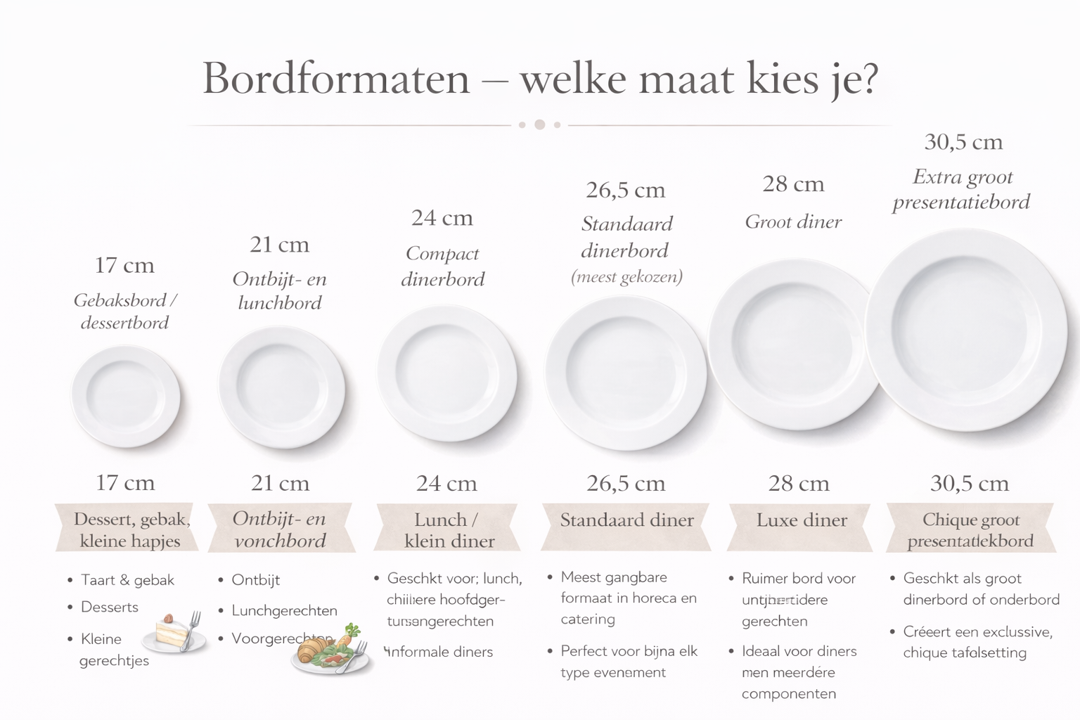 Of je nu een intiem diner organiseert, een uitgebreide bruiloft, een buffet of een zakelijk evenement – met de juiste combinatie van bordformaten creëer je een stijlvolle en logische tafelopbouw.