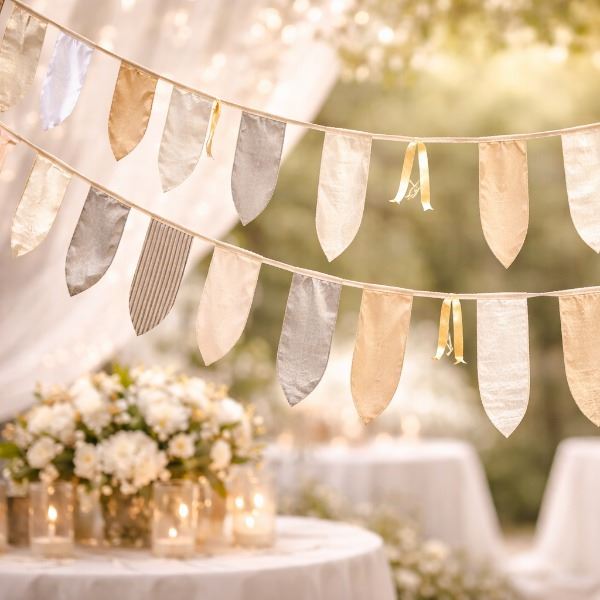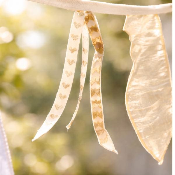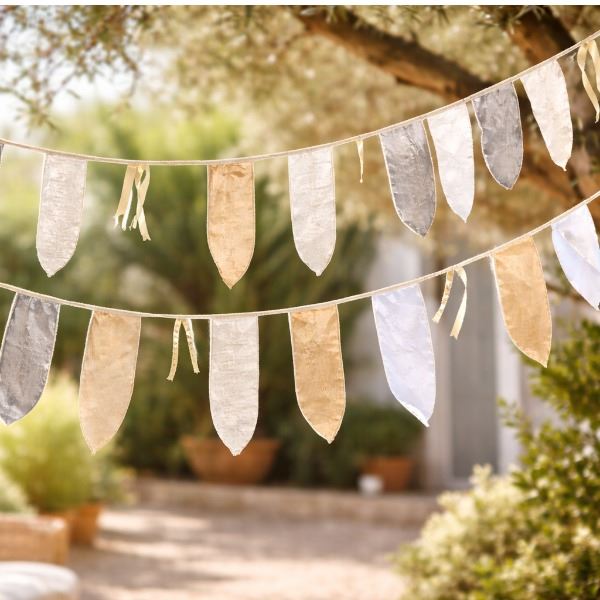 Deze vlaggenlijn is ideaal als achtergrond bij een ceremonie, boven een dinertafel, langs een stretchtent of als sfeervolle aankleding van een feestlocatie. De natuurlijke kleuren combineren prachtig met bloemen, hout en linnen en sluiten naadloos aan bij een trouwdecoratie of luxe event styling.