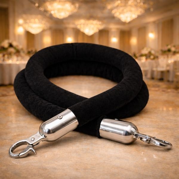 Dit zwarte fluwelen afzetkoord met chroomkleurige haken geeft elke entree, looproute of VIP-zone direct een luxe en verzorgde uitstraling. Ideaal voor evenementen, bruiloften, gala’s, openingen en zakelijke bijeenkomsten.